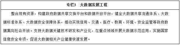 (三)實施國家大數(shù)據(jù)戰(zhàn)略。落實大數(shù)據(jù)發(fā)展行動綱要,全面推進重點領域大數(shù)據(jù)高效采集、有效整合、公開共享和應用拓展,完善監(jiān)督管理制度,強化安全保障,推動相關產業(yè)創(chuàng)新發(fā)展。