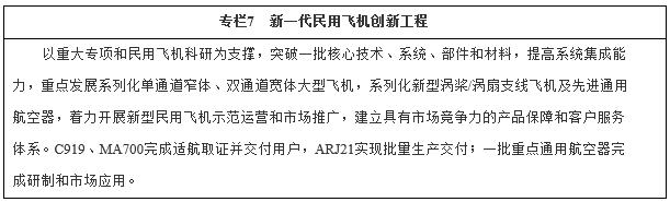 (二)實現(xiàn)航空產業(yè)新突破。加強自主創(chuàng)新,推進民用航空產品產業(yè)化、系列化發(fā)展,加強產業(yè)配套設施和安全運營保障能力建設,提高產品安全性、環(huán)保性、經(jīng)濟性和舒適性,全面構建覆蓋航空發(fā)動機、飛機整機、產業(yè)配套和安全運營的航空產業(yè)體系。到2020年,民用大型客機、新型支線飛機完成取證交付,航空發(fā)動機研制實現(xiàn)重大突破,產業(yè)配套和示范運營體系基本建立。