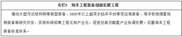 加快發(fā)展新型海洋工程裝備。突破浮式鉆井生產儲卸裝置、浮式液化天然氣儲存和再氣化裝置、深吃水立柱式平臺、張力腿平臺、極地鉆井平臺、海上試驗場等研發(fā)設計和建造技術,建立規(guī)模化生產制造工藝體系,產品性能及可靠性達到國際先進水平。