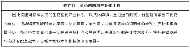 (一)構建生物醫(yī)藥新體系。加快開發(fā)具有重大臨床需求的創(chuàng)新藥物和生物制品,加快推廣綠色化、智能化制藥生產技術,強化科學高效監(jiān)管和政策支持,推動產業(yè)國際化發(fā)展,加快建設生物醫(yī)藥強國。
