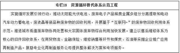 積極開展新品種廢棄物循環(huán)利用。開展新品種廢棄物回收利用體系示范,推動廢棄太陽能電池、廢舊動力蓄電池、廢碳纖維材料、廢節(jié)能燈等新型廢棄物回收利用,推廣稀貴金屬高效富集與清潔回收利用、電動汽車動力蓄電池梯級利用等。支持碳捕集、利用和封存技術研發(fā)與應用,發(fā)展碳循環(huán)產業(yè)。