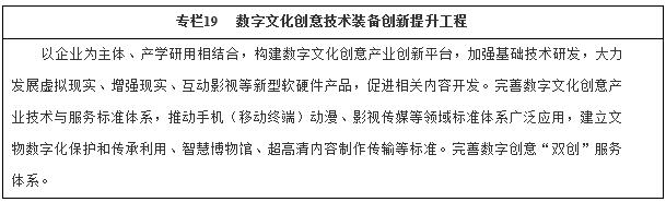 (一)創(chuàng)新數(shù)字文化創(chuàng)意技術和裝備。適應沉浸式體驗、智能互動等趨勢,加強內容和技術裝備協(xié)同創(chuàng)新,在內容生產技術領域緊跟世界潮流,在消費服務裝備領域建立國際領先優(yōu)勢,鼓勵深度應用相關領域最新創(chuàng)新成果。