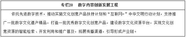 以數(shù)字技術和先進理念推動文化創(chuàng)意與創(chuàng)新設計等產業(yè)加快發(fā)展,促進文化科技深度融合、相關產業(yè)相互滲透。到2020年,形成文化引領、技術先進、鏈條完整的數(shù)字創(chuàng)意產業(yè)發(fā)展格局,相關行業(yè)產值規(guī)模達到8萬億元。