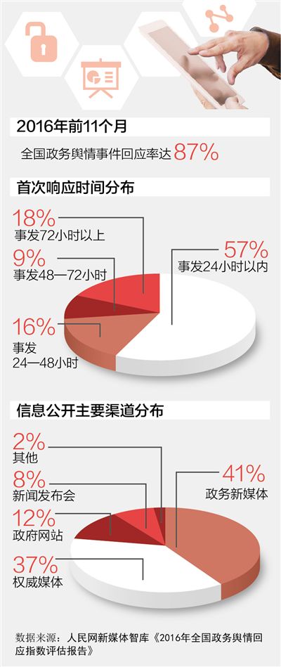 人民網(wǎng)新媒體智庫分析顯示,2016年1月—11月的600多起輿情案例中,政府回應(yīng)率達(dá)到87%,有57%以上的事件政府首次響應(yīng)在事發(fā)24小時(shí)之內(nèi),有73%的事件政府部門首次回應(yīng)在48小時(shí)之內(nèi)(含24小時(shí))。其中,41%的事件通過政務(wù)新媒體作出回應(yīng)(右圖)。
