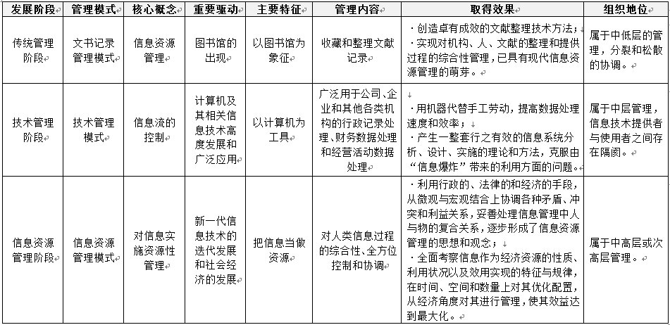然而,這一理論在中國一直沒有得到良好的實踐支撐。從歷史和全局的發(fā)展角度看,信息資源管理已經(jīng)經(jīng)歷了三個發(fā)展階段,從文書記錄的傳統(tǒng)管理模式,到依托計算機的技術(shù)管理模式,再到目前的信息資源管理模式,下表圍繞核心概念、重要驅(qū)動、主要特征、管理內(nèi)容、組織地位等對不同階段的管理模式做了簡單的對比分析。可以發(fā)現(xiàn),不同時期的管理模式都是適應(yīng)時代發(fā)展的要求而出現(xiàn)的,信息作為一種資源,在當時都發(fā)揮了積極的作用。但是從其本身所蘊含的價值來看,其作為一種生產(chǎn)要素或經(jīng)濟要素的價值還遠遠沒有被開發(fā)出來,這也就是為什么大多數(shù)人還沒有建立起對信息資源應(yīng)有的認識。