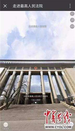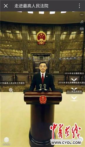 一經掃描,頁面即彈出最高人民法院主建筑畫面,滑動屏幕,還可360度旋轉看到院內的大門、綠化帶等場景。 VR中的主建筑正門處,有一個“2017年最高人民法工作報告”的圓點。點擊后,映入眼簾的是最高人民法院院長周強站在發(fā)言臺前的圖像。 提到最高法加強庭審公開的時候,他說了一組數據:自去年7月1日起,所有公開開庭案件都上網直播,各級法院直播庭審62.5萬次,觀看量達到20.7億人次。