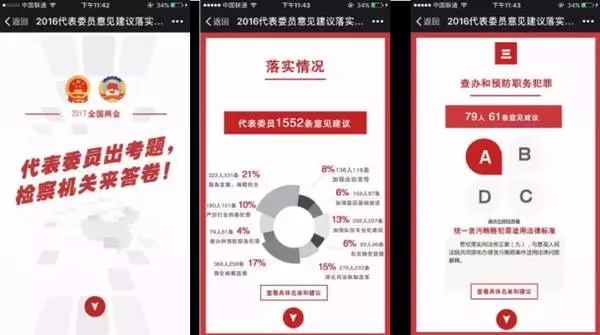 《最高人民檢察院工作報告》首頁上同樣出現了二維碼,掃描后的頁面中有輕快的背景音樂配合活潑的動畫,通過一組組數據和案例,從維穩(wěn)、經濟、反腐、司法公正等7個方面,體現了2016年檢察機關的工作成果,還包括2017年檢察機關工作計劃 除此之外,還有一個互動性的H5《代表委員出題,檢察機關來答卷》。