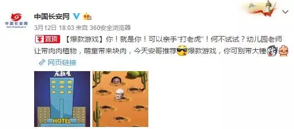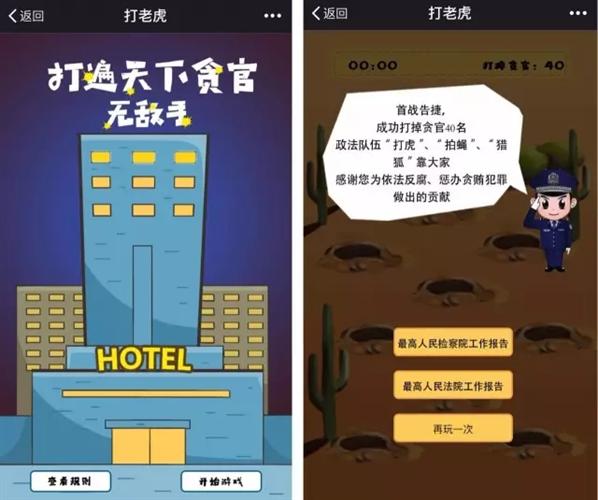 政法新媒體“長安劍”推出了一款名為“打老虎”的H5小游戲,玩法類似于大家都很熟悉的“打地鼠”,不過從地洞里鉆出來的不是地鼠,而是“老虎”,也就是已被“打倒”的貪官頭像。