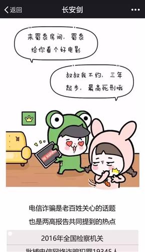 除了互動小游戲,“長安劍”還與“蛙哥漫畫”合作,推出了《3分鐘讓你看懂“兩高報告”》(看到這個題目,是不是想到了谷阿莫的《x分鐘看完xxx》系列?),用軟萌的畫風、活潑的對話把“兩高報告”中的重點內容傳達了出來。