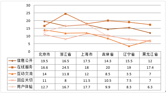 2016年省級(jí)政府網(wǎng)站評(píng)估指標(biāo)包括信息公開、在線服務(wù)、互動(dòng)交流、回應(yīng)關(guān)切與用戶體驗(yàn)五大類指標(biāo),為分析東北區(qū)域政府網(wǎng)站發(fā)展情況,選取本次績效評(píng)估前三名(北京市、浙江省、上海市)政府網(wǎng)站作為對(duì)照,具體情況見下圖。