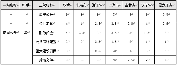 信息公開方面,全國平均績效得分為15.57分,得分率為61.47%,北、浙、上平均績效得分為17.83分,東北區(qū)域省級(jí)政府信息公開平均績效得分為13.93分。2016年省級(jí)政府門戶網(wǎng)站評(píng)估得分統(tǒng)計(jì)表顯示,東北區(qū)域整體情況較好,較去年有了明顯提升,但三省網(wǎng)站均存在短板,在個(gè)別二級(jí)指標(biāo)上扣分嚴(yán)重,例如黑龍江省政府網(wǎng)站在權(quán)責(zé)清單公開上失分較多;吉林省政府網(wǎng)站在重大建設(shè)項(xiàng)目指標(biāo)上失分較多;遼寧省政府網(wǎng)站在公共資源配置指標(biāo)上失分較多,如表1。