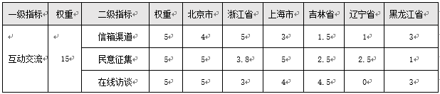 互動(dòng)交流方面,全國平均績效得分為9分,得分率為60.02%,北、浙、上平均績效得分為12.6分,東北區(qū)域省級(jí)政府互動(dòng)交流平均績效得分為6.33分。從下表可以看出,北、浙、上三家網(wǎng)站在信箱渠道、民意征集、在線訪談上得分較為平穩(wěn);吉林省政府網(wǎng)站經(jīng)過改版后,在互動(dòng)交流渠道建設(shè)和反饋能力上進(jìn)步較大,完善答復(fù)反饋機(jī)制,切實(shí)提高政府公信力;黑龍江、遼寧兩省在互動(dòng)交流上發(fā)展相對(duì)不均衡,短板較明顯,例如遼寧省政府網(wǎng)站未設(shè)置在線訪談渠道,該項(xiàng)未得分,互動(dòng)交流建設(shè)仍有較大進(jìn)步空間。