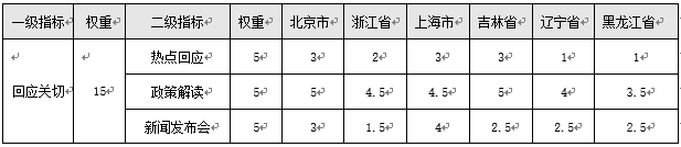 回應(yīng)關(guān)切方面,全國平均績效得分為8.05分,得分率為53.66%,北、浙、上平均績效得分為10.17分,東北區(qū)域省級(jí)政府回應(yīng)關(guān)切平均績效得分為8.3分。我國省級(jí)政府網(wǎng)站在回應(yīng)關(guān)切指標(biāo)上未達(dá)到及格水平,全國范圍內(nèi)整體水平均較低。東北區(qū)域政府網(wǎng)站在該項(xiàng)指標(biāo)上失分較多,各家單位在及時(shí)回應(yīng)社會(huì)熱點(diǎn)事件、引導(dǎo)網(wǎng)絡(luò)輿情方面還有較大的提升空間。