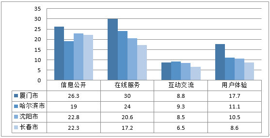 根據(jù)上圖可以發(fā)現(xiàn),哈爾濱市、沈陽市及長春市政府網(wǎng)站較廈門市政府網(wǎng)站差距較大,信息公開和互動(dòng)交流情況相對(duì)較好,在線服務(wù)和用戶體驗(yàn)指標(biāo)上得分呈現(xiàn)兩極化態(tài)勢(shì),在線辦事服務(wù)流程和服務(wù)實(shí)用程度進(jìn)一步提升,但與社會(huì)公眾需求還存在較大差距,主要表現(xiàn)在公眾關(guān)注度高的各類公共服務(wù)資源整合力度不佳、公開不全面,在線辦事的人性化程度不高,未對(duì)各業(yè)務(wù)系統(tǒng)進(jìn)行有效整合等;新媒體和移動(dòng)客戶端進(jìn)入高速發(fā)展期,網(wǎng)站提供二維碼掃描、鏈接,社交分享的能力也得到了加強(qiáng);但智能服務(wù)、數(shù)據(jù)開放和國際化程度指標(biāo)得分仍然偏低,尤其是數(shù)據(jù)開放方面,網(wǎng)站僅發(fā)布了統(tǒng)計(jì)數(shù)據(jù)信息,開放數(shù)據(jù)涉及的領(lǐng)域及深度均有待加強(qiáng)。
