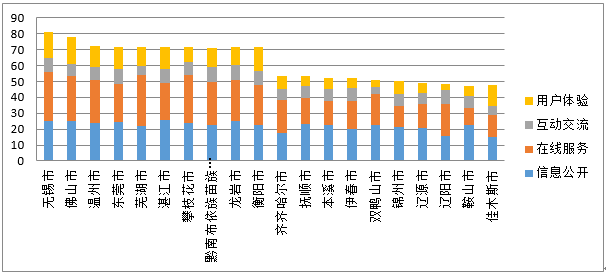 2016年地市級(jí)網(wǎng)站評(píng)估指標(biāo)包括信息公開、在線服務(wù)、互動(dòng)交流與用戶體驗(yàn)四大類指標(biāo)。本次評(píng)估平均分得分為50.38分,有158個(gè)單位總得分超過整體平均得分,占比52.84%,70分以上的單位有16個(gè),僅占5.35%,東北三省無單位入選;30分以下單位有22個(gè),占比7.36%,東北三省3家單位入選。其中,齊齊哈爾市位列東北區(qū)域排名第一,占總排名135位,隨后依次是撫順市、本溪市等政府網(wǎng)站。為探討東北區(qū)域地市級(jí)網(wǎng)站發(fā)展現(xiàn)狀,選取2016年地市級(jí)網(wǎng)站建設(shè)總體情況排名前十名(無錫市、佛山市、溫州市、東莞市、蕪湖市、湛江市、攀枝花市、黔南布依族苗族自治州、龍巖市、衡陽市)與東北區(qū)域前十名(齊齊哈爾市、撫順市、本溪市、伊春市、雙鴨山市、錦州市、遼源市、遼陽市、鞍山市、佳木斯市)相比,制成下圖。