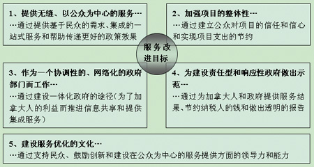 ?。?)改善服務(wù)。包括擴(kuò)大服務(wù)網(wǎng)絡(luò)在地區(qū)和社區(qū)中的延伸;設(shè)計(jì)服務(wù)策略以迎合加拿大人的需求;加強(qiáng)服務(wù)網(wǎng)絡(luò)自身的能力建設(shè);構(gòu)建合作伙伴戰(zhàn)略;提高新服務(wù)開(kāi)發(fā)能力;將所有的呼叫中心集成。