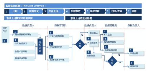 人民銀行與銀監(jiān)會(huì)也非常重視數(shù)據(jù)治理,從08年開始,在全國(guó)銀行業(yè)推行統(tǒng)一的數(shù)據(jù)標(biāo)準(zhǔn),控制行業(yè)的數(shù)據(jù)質(zhì)量。工行、建行、國(guó)開等大型銀行,對(duì)數(shù)據(jù)治理都非常重視。08年前,我們與國(guó)開一起開始了數(shù)據(jù)治理的建設(shè),下圖展示的就是國(guó)開銀行針對(duì)數(shù)據(jù)全生命周期的數(shù)據(jù)管控。