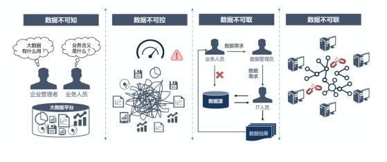 數(shù)據(jù)不可知:用戶不知道大數(shù)據(jù)平臺(tái)中有哪些數(shù)據(jù),也不知道這些數(shù)據(jù)和業(yè)務(wù)的關(guān)系是什么,雖然意識(shí)到了大數(shù)據(jù)的重要性,但平臺(tái)中有沒有能解決自己所面臨業(yè)務(wù)問題的關(guān)鍵數(shù)據(jù)?該到哪里尋找這些數(shù)據(jù)?
