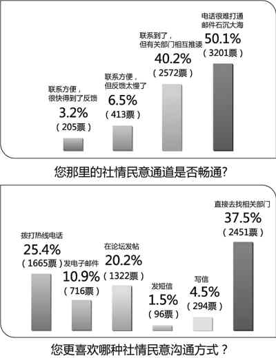 在通訊方式日新月異的今天,網(wǎng)友更喜歡哪種社情民意溝通方式?調(diào)查顯示,如果有問題向政府咨詢或者投訴,直接去找相關(guān)部門仍是網(wǎng)友的首選,37.5%的人選擇了這種方式。而選擇撥打熱線電話的網(wǎng)友超過25%,選擇發(fā)電子郵件、在論壇發(fā)帖、發(fā)短信等新興通訊方式的超過30%,只有4.5%的網(wǎng)友選擇傳統(tǒng)的書信聯(lián)系方式。