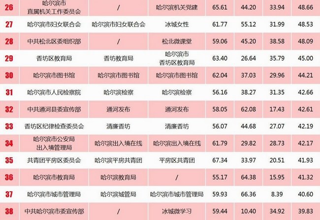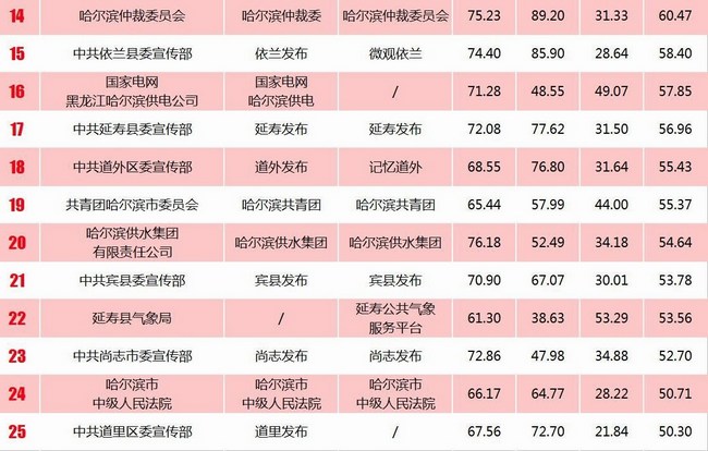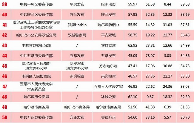 《報(bào)告》推出“哈爾濱政務(wù)新媒體綜合影響力榜單”“哈爾濱市直單位政務(wù)新媒體綜合影響力榜單”“哈爾濱區(qū)、縣(市)政務(wù)新媒體綜合影響力榜單”“哈爾濱基層單位政務(wù)新媒體綜合影響力榜單”“哈爾濱市新聞單位新媒體影響力榜單”,統(tǒng)計(jì)時(shí)間為2014至2016年。在全市綜合影響力十強(qiáng)榜單中,市直機(jī)構(gòu)呈現(xiàn)壓倒性優(yōu)勢(shì),占據(jù)7個(gè)席位,區(qū)縣(市)機(jī)構(gòu)占據(jù)3席。
