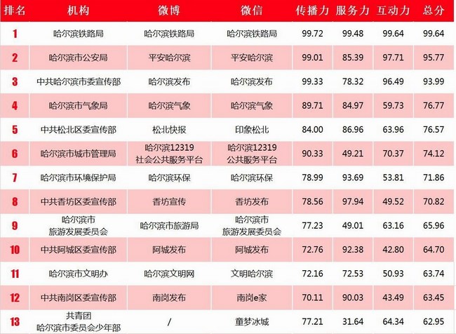 《報(bào)告》從傳播力、服務(wù)力、互動(dòng)力三個(gè)維度對(duì)哈爾濱市政務(wù)機(jī)構(gòu)和媒體機(jī)構(gòu)開設(shè)的微博、微信賬號(hào)進(jìn)行綜合考量和系統(tǒng)評(píng)估分析,客觀地反映了哈爾濱市各級(jí)黨政機(jī)關(guān)在政務(wù)新媒體平臺(tái)中的綜合表現(xiàn)?!秷?bào)告》指出:近年來,哈爾濱各級(jí)黨政部門政務(wù)新媒體意識(shí)不斷增強(qiáng),“雙微”平臺(tái)在發(fā)布內(nèi)容上更趨多元、風(fēng)格更加親民、互動(dòng)明顯增強(qiáng),已成為傳遞黨和政府聲音、回應(yīng)公眾關(guān)切、創(chuàng)新工作形式、提高政務(wù)效能的重要載體。截至目前,已報(bào)備登記的哈爾濱政務(wù)新媒體607個(gè),無論是賬號(hào)數(shù)量還是影響力都在全省各地市居遙遙領(lǐng)先地位?!癅哈爾濱發(fā)布”連續(xù)三年在全國政務(wù)新媒體排行中進(jìn)入百強(qiáng)?!癅哈爾濱鐵路局”“@平安哈爾濱”在本行業(yè)本系統(tǒng)政務(wù)新媒體排行中也躋身先進(jìn)行列。
