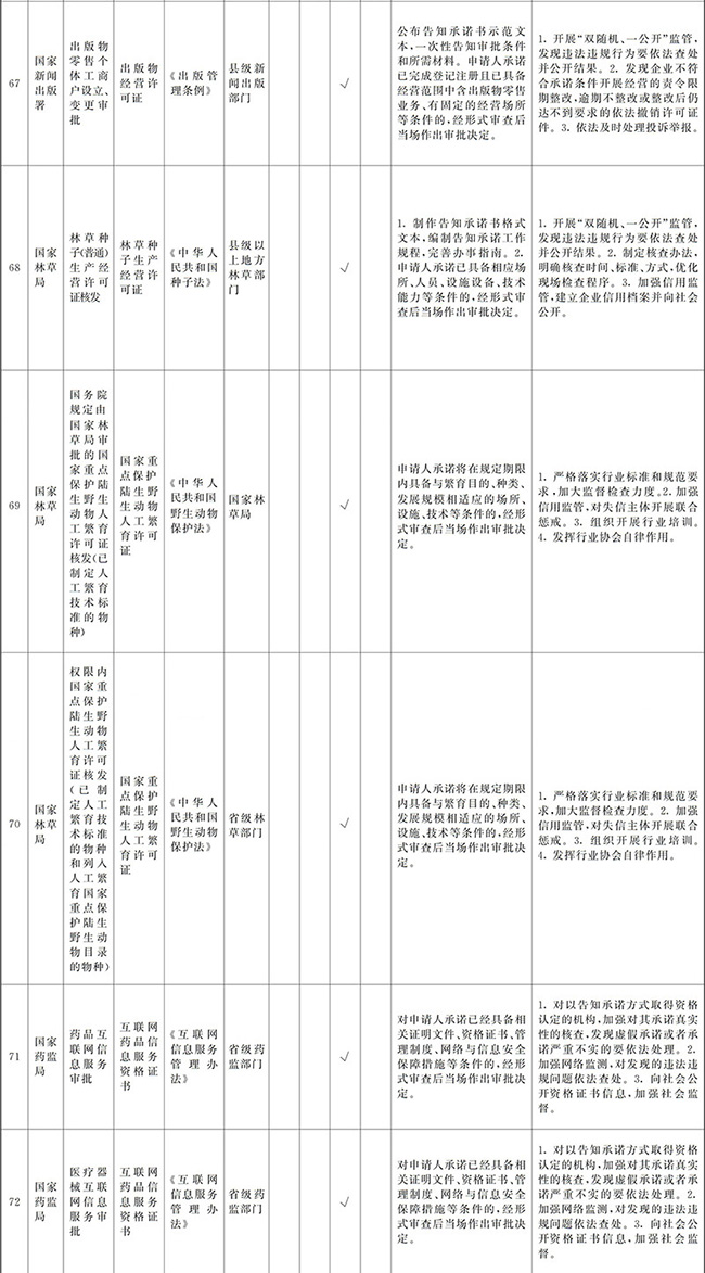 ?。ㄈ嵭懈嬷兄Z。對確需保留的涉企經(jīng)營許可事項,企業(yè)就符合經(jīng)營許可條件作出承諾,有關(guān)主管部門通過事中事后監(jiān)管能夠糾正不符合經(jīng)營許可條件行為、有效防范風險的,實行告知承諾。