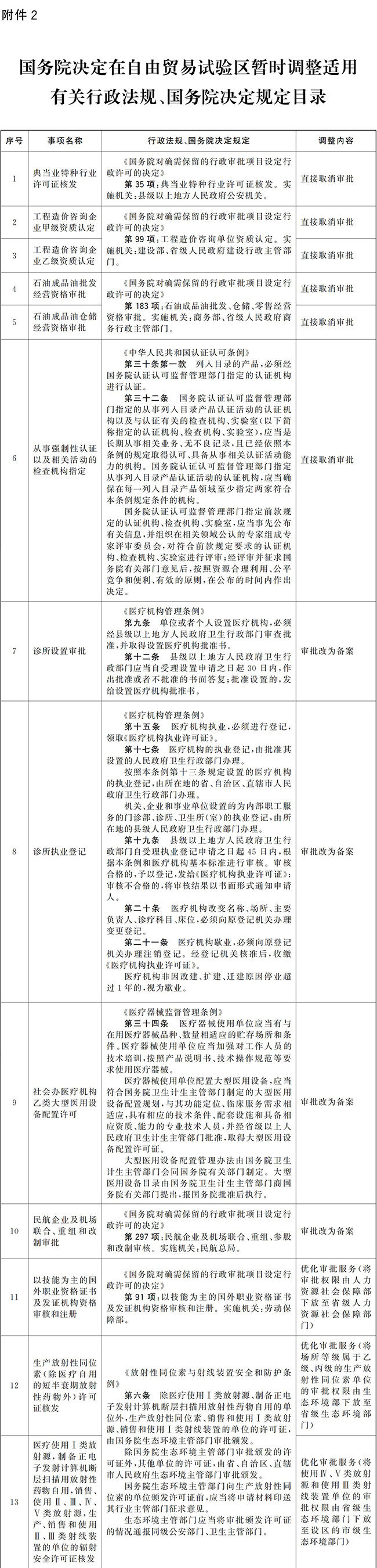 2.國務院決定在自由貿(mào)易試驗區(qū)暫時調(diào)整適用有關(guān)行政法規(guī)、國務院決定規(guī)定目錄