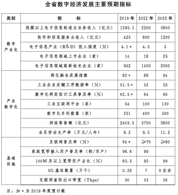 5.數(shù)字基礎(chǔ)設(shè)施達(dá)到國內(nèi)先進(jìn)水平。基本建成高速寬帶、無縫覆蓋、智能適配的新一代信息網(wǎng)絡(luò),互聯(lián)網(wǎng)普及率達(dá)到70%、寬帶接入用戶普及率達(dá)到99%、5G基站數(shù)量達(dá)到7萬個(gè)。智能傳感設(shè)施“云—邊—端”模式基本覆蓋交通、電力、城市建設(shè)等領(lǐng)域。