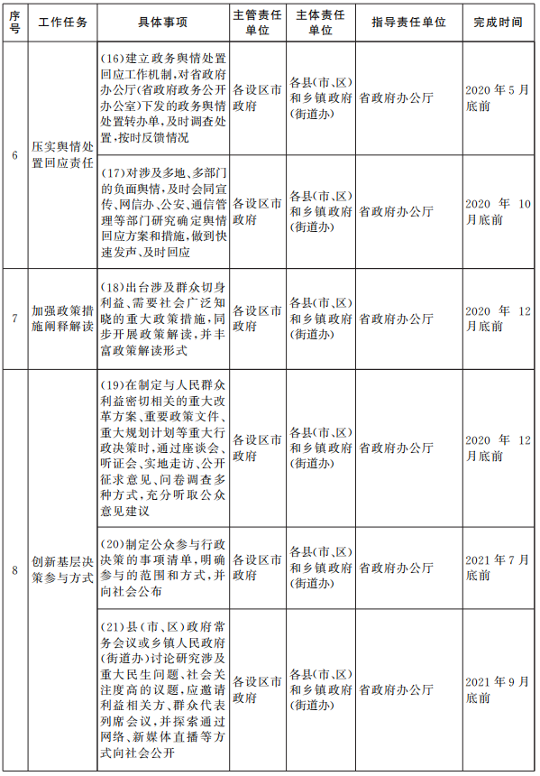 十五、形成協(xié)調(diào)聯(lián)動工作合力。2020年6月底前,各縣(市、區(qū))要制定全面推進(jìn)基層政務(wù)公開標(biāo)準(zhǔn)化規(guī)范化的實(shí)施方案,明確責(zé)任,細(xì)化分工,抓好落實(shí)。各設(shè)區(qū)市政府辦公室要加強(qiáng)對全市基層政務(wù)公開標(biāo)準(zhǔn)化規(guī)范化工作的統(tǒng)籌協(xié)調(diào)和監(jiān)督檢查,督促指導(dǎo)所轄縣(市、區(qū))扎實(shí)開展相關(guān)工作。各縣(市、區(qū))政府辦公室作為政務(wù)公開主管部門,在做好本級政府政務(wù)公開事項(xiàng)標(biāo)準(zhǔn)目錄體系編制工作的同時,要加強(qiáng)對所轄鄉(xiāng)鎮(zhèn)(街道)和政府部門的督促指導(dǎo),統(tǒng)籌推進(jìn)基層政務(wù)公開標(biāo)準(zhǔn)化規(guī)范化工作;要建立健全與宣傳、網(wǎng)信、政務(wù)服務(wù)、大數(shù)據(jù)管理、融媒體中心等單位的協(xié)調(diào)聯(lián)動機(jī)制,形成工作合力。省政府有關(guān)部門要對本系統(tǒng)、本領(lǐng)域基層政務(wù)公開標(biāo)準(zhǔn)化規(guī)范化工作進(jìn)行督促指導(dǎo)和跟蹤評估。