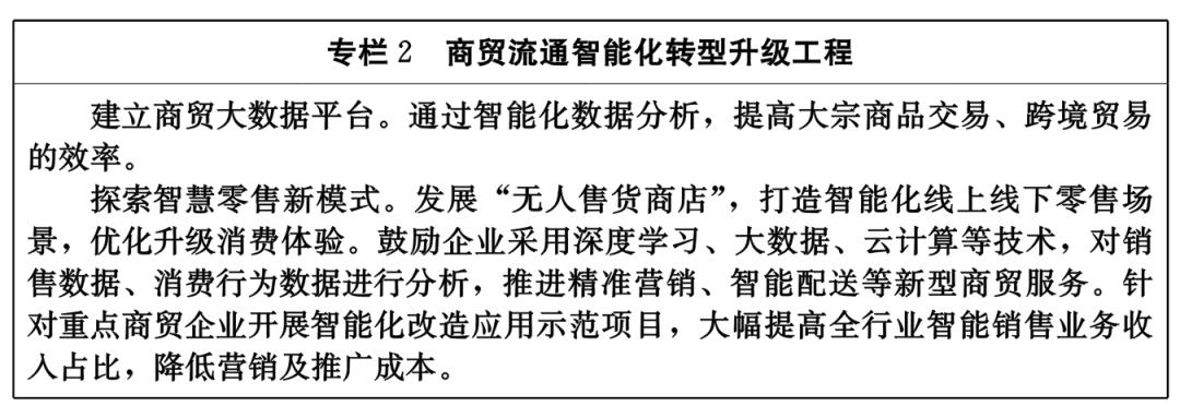 3.智能商務(wù)。鼓勵(lì)跨媒體分析與推理、知識(shí)計(jì)算引擎與知識(shí)服務(wù)等新技術(shù)在商務(wù)領(lǐng)域應(yīng)用,推廣基于人工智能的新型商務(wù)服務(wù)與決策系統(tǒng)。積極支持各類特色商務(wù)云平臺(tái)、電子商務(wù)服務(wù)平臺(tái)發(fā)展,推進(jìn)商務(wù)信用信息綜合平臺(tái)建設(shè),加快推動(dòng)企業(yè)及平臺(tái)數(shù)字化、智能化轉(zhuǎn)型。拓展商務(wù)大數(shù)據(jù)采集和分析應(yīng)用,加快精準(zhǔn)營銷、智能配送、供應(yīng)鏈管理等新型商貿(mào)服務(wù)發(fā)展,支持人工智能技術(shù)在現(xiàn)代商務(wù)全流程的示范應(yīng)用及創(chuàng)新。