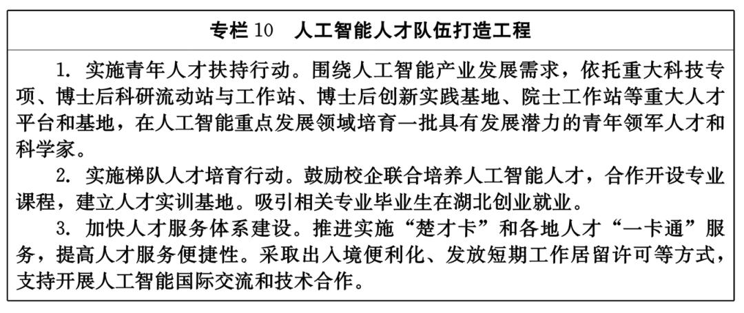 (四)構(gòu)建人工智能人才高地。引導(dǎo)和鼓勵(lì)高校設(shè)立人工智能相關(guān)學(xué)科專業(yè),支持高校人工智能學(xué)科建設(shè)。構(gòu)建政產(chǎn)學(xué)研用聯(lián)動(dòng)的人才需求對(duì)接和定向培養(yǎng)機(jī)制,依托武漢大學(xué)、華中科技大學(xué)、武漢理工大學(xué)等高校以及中科院測量與地球物理研究所等科研院所科教資源,加大人工智能人才培養(yǎng)力度,構(gòu)建面向產(chǎn)業(yè)發(fā)展前沿的多層次、高質(zhì)量人才團(tuán)隊(duì)。鼓勵(lì)校企合作,在人工智能重點(diǎn)發(fā)展領(lǐng)域培育一批具有發(fā)展?jié)摿Φ那嗄觐I(lǐng)軍人才和科學(xué)家。大力引進(jìn)人工智能基礎(chǔ)理論、關(guān)鍵技術(shù)等領(lǐng)域的高端緊缺人才和高水平創(chuàng)新團(tuán)隊(duì)。支持市場化培訓(xùn)機(jī)構(gòu)、人才繼續(xù)教育實(shí)訓(xùn)基地和高技能人才培養(yǎng)基地等,開展人工智能緊缺急需專業(yè)技術(shù)人才和高技能人才培訓(xùn)。鼓勵(lì)人工智能企業(yè)通過長短期聘用、項(xiàng)目合作、技術(shù)咨詢等柔性引才方式,靈活引進(jìn)高端人才。向入選“楚才引領(lǐng)計(jì)劃”的人工智能領(lǐng)域高端緊缺人才發(fā)放“楚才卡”,提供落戶居留、子女就學(xué)、醫(yī)療保健、安居保障、出入境等“一卡通”專員服務(wù)。發(fā)揮股權(quán)激勵(lì)專項(xiàng)基金、人才發(fā)展基金等作用,留住并激勵(lì)人工智能高端人才。