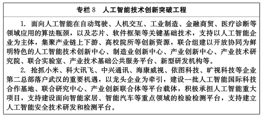 ?。ㄒ唬┙ㄔO(shè)協(xié)同創(chuàng)新研發(fā)平臺(tái)。重點(diǎn)支持高校、科研院所聯(lián)合人工智能企業(yè)建立有利于協(xié)同創(chuàng)新和成果轉(zhuǎn)化的新型研發(fā)機(jī)構(gòu)、概念驗(yàn)證實(shí)驗(yàn)室等技術(shù)研發(fā)平臺(tái),支持高校、企業(yè)申報(bào)國家級(jí)科研平臺(tái),促進(jìn)人工智能前沿核心技術(shù)和應(yīng)用技術(shù)開發(fā)研究。面向全球精準(zhǔn)引進(jìn)一批人工智能領(lǐng)域世界先進(jìn)水平科研中心、實(shí)驗(yàn)室等國際高端研發(fā)機(jī)構(gòu)。搶抓一批高科技龍頭企業(yè)第二總部落戶武漢的機(jī)遇,建設(shè)人工智能國際科技合作基地、聯(lián)合研究中心等平臺(tái)載體,積極承擔(dān)人工智能重大項(xiàng)目,形成產(chǎn)業(yè)技術(shù)創(chuàng)新高地。鼓勵(lì)建設(shè)人工智能領(lǐng)域國家級(jí)檢驗(yàn)檢測平臺(tái)。