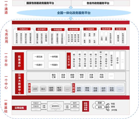 一個(gè)中心:建設(shè)江淮大數(shù)據(jù)中心,搭建省級(jí)總平臺(tái)、行業(yè)部門分平臺(tái)、各市子平臺(tái)的平臺(tái)框架體系,匯聚政務(wù)、社會(huì)、經(jīng)濟(jì)等數(shù)據(jù)資源,為“數(shù)字政府”建設(shè)提供數(shù)據(jù)支撐。