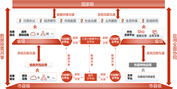 省級(jí)統(tǒng)籌建設(shè)省級(jí)政務(wù)云、電子政務(wù)外網(wǎng)、江淮大數(shù)據(jù)中心總平臺(tái)等通用基礎(chǔ)設(shè)施,搭建省級(jí)共性應(yīng)用支撐平臺(tái),統(tǒng)籌推進(jìn)省級(jí)基礎(chǔ)性通用應(yīng)用系統(tǒng)建設(shè)。市級(jí)統(tǒng)籌建設(shè)市級(jí)政務(wù)云、電子政務(wù)外網(wǎng)、江淮大數(shù)據(jù)中心子平臺(tái)等基礎(chǔ)設(shè)施,依托省級(jí)共性應(yīng)用支撐平臺(tái),根據(jù)需要拓展市級(jí)共性應(yīng)用支撐能力,承接使用省級(jí)統(tǒng)建的應(yīng)用系統(tǒng),開發(fā)部署地方特色應(yīng)用。縣級(jí)及以下原則上不再單獨(dú)建設(shè)政務(wù)云、數(shù)據(jù)中心等基礎(chǔ)設(shè)施,依托市級(jí)基礎(chǔ)設(shè)施和共性應(yīng)用支撐能力,承接使用省市部署的各類應(yīng)用系統(tǒng),開發(fā)部署地方特色應(yīng)用。各級(jí)政務(wù)部門非涉密信息系統(tǒng)原則上依托江淮大數(shù)據(jù)中心及政務(wù)云進(jìn)行建設(shè)和部署。除國(guó)家另有規(guī)定外,各政務(wù)部門原則上不得新建數(shù)據(jù)中心、機(jī)房;已經(jīng)建成的應(yīng)當(dāng)與江淮大數(shù)據(jù)中心平臺(tái)和政務(wù)云平臺(tái)互聯(lián)互通、數(shù)據(jù)共享。