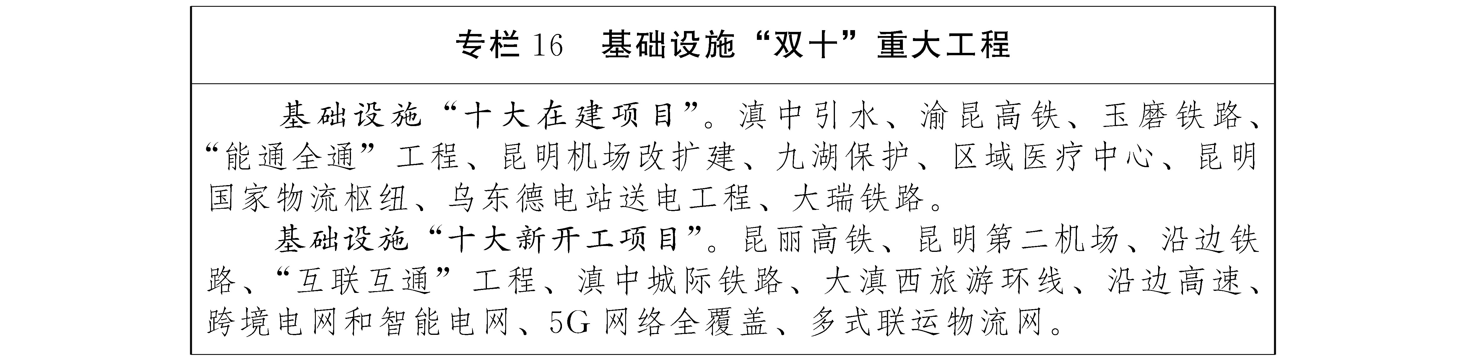 ——基礎(chǔ)設(shè)施建設(shè)實(shí)現(xiàn)歷史性突破。基礎(chǔ)設(shè)施建設(shè)實(shí)現(xiàn)由瓶頸制約向基本適應(yīng)的根本性轉(zhuǎn)變。以滬昆、南昆高鐵開(kāi)通為標(biāo)志,我省進(jìn)入高鐵時(shí)代??h域高速公路“能通全通”工程建設(shè)成效顯著,16個(gè)州市、110個(gè)縣市區(qū)實(shí)現(xiàn)高速公路通車,“十三五”新增高速公路里程5000公里,是我省“十二五”末通車總里程的1.25倍。怒江美麗公路主線建成通車。滇中引水工程全線開(kāi)工。建成投產(chǎn)10座巨型、大型水電站,是我省歷史上投產(chǎn)大型電站最多的5年。中緬油氣管道建成運(yùn)營(yíng),告別缺油少氣時(shí)代。全省實(shí)現(xiàn)4G網(wǎng)絡(luò)全覆蓋。