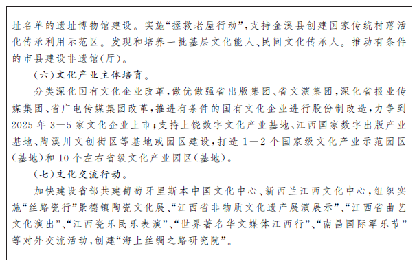 高標(biāo)準(zhǔn)建設(shè)景德鎮(zhèn)國家陶瓷文化傳承創(chuàng)新試驗區(qū),努力打造“兩地一中心”兩地一中心:國家陶瓷文化保護(hù)傳承創(chuàng)新基地、世界著名陶瓷文化旅游目的地、國際陶瓷文化交流合作交易中心。。全面推進(jìn)南昌漢代?;韬顕z址、景德鎮(zhèn)御窯廠遺址等國家考古遺址公園建設(shè),構(gòu)建更具江西特色的考古遺址公園體系和遺址博物館群。深入開展江西歷史文化專題研究闡釋,推進(jìn)書院文化、稻作文化、戲曲文化、中醫(yī)藥文化、陽明文化等特色歷史文化傳承創(chuàng)新,推動婺源徽州文化、贛南客家文化、景德鎮(zhèn)陶瓷文化、吉安廬陵文化、撫州戲曲文化等文化生態(tài)保護(hù)區(qū)(實驗區(qū))建設(shè)。加強(qiáng)世界文化遺產(chǎn)、重點文物保護(hù)單位、歷史文化名城名鎮(zhèn)名村、傳統(tǒng)村落保護(hù)和利用。強(qiáng)化非物質(zhì)文化遺產(chǎn)系統(tǒng)性保護(hù)。加強(qiáng)優(yōu)秀傳統(tǒng)手工藝保護(hù)和傳承。開展贛鄱文化資源普查,深化古籍整理研究。加強(qiáng)地方志工作。啟動《江右文庫》編纂工程。