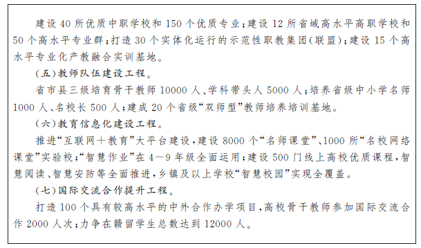 推進(jìn)高等教育分類管理和高等學(xué)校綜合改革,推動高等教育由數(shù)量規(guī)模型向內(nèi)涵質(zhì)量型轉(zhuǎn)變,全面提升人才培養(yǎng)質(zhì)量和科技創(chuàng)新能力。持續(xù)推進(jìn)高等學(xué)?!半p一流”建設(shè),舉全省之力辦好南昌大學(xué),爭取進(jìn)入世界一流大學(xué)建設(shè)高校行列。支持更多特色高校建設(shè)世界一流學(xué)科。優(yōu)化高等教育布局,主動融入國家重大戰(zhàn)略和全省發(fā)展需求,創(chuàng)建若干應(yīng)用型本科院校,引導(dǎo)部分省屬本科院校轉(zhuǎn)型建設(shè)高水平應(yīng)用型高校,加快培養(yǎng)理工農(nóng)醫(yī)類專業(yè)緊缺人才。深化高校省部共建體制機(jī)制,加大力度吸引國內(nèi)外知名高校在江西開展合作辦學(xué),爭取更多支持,豐富辦學(xué)資源,擴(kuò)大教育供給。穩(wěn)步擴(kuò)大研究生培養(yǎng)規(guī)模,深化研究生教育改革,提升高層次人才培養(yǎng)質(zhì)量。擴(kuò)大學(xué)校辦學(xué)自主權(quán),推進(jìn)高校建立以章程為核心的制度體系。