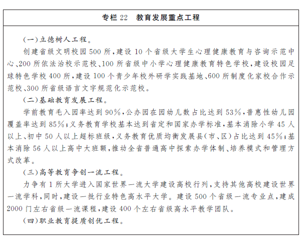 提升縣域義務(wù)教育基本均衡水平,推進(jìn)義務(wù)教育優(yōu)質(zhì)均衡發(fā)展,推進(jìn)城鄉(xiāng)學(xué)校在辦學(xué)條件、教師隊伍建設(shè)等方面全面達(dá)標(biāo),穩(wěn)步推進(jìn)義務(wù)教育城鄉(xiāng)一體化。建立健全適應(yīng)學(xué)齡人口變化的學(xué)校布局調(diào)整機(jī)制,加快城鎮(zhèn)學(xué)校建設(shè),增加學(xué)位供給,保障農(nóng)業(yè)轉(zhuǎn)移人口隨遷子女平等享受基本公共教育服務(wù)。綜合利用閑置校園校舍,加強(qiáng)鄉(xiāng)村寄宿制學(xué)校建設(shè)。穩(wěn)定鄉(xiāng)村教師隊伍,完善留守兒童關(guān)愛體系和義務(wù)教育控輟保學(xué)體系。加大高中階段教育普及攻堅,鼓勵高中階段學(xué)校多樣化、特色化發(fā)展,穩(wěn)步推進(jìn)高考綜合改革。加強(qiáng)公辦幼兒園建設(shè),嚴(yán)格落實城鎮(zhèn)小區(qū)配套園政策,構(gòu)建建設(shè)管理長效機(jī)制,多渠道增加普惠性幼兒園供給,不斷深化學(xué)前教育普及普惠安全優(yōu)質(zhì)發(fā)展。支持和規(guī)范民辦教育發(fā)展,全面規(guī)范校外培訓(xùn)機(jī)構(gòu)。辦好特殊教育、民族教育和專門教育。