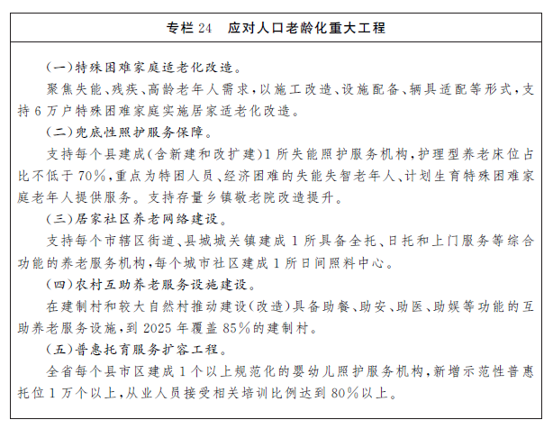 推動養(yǎng)老事業(yè)和養(yǎng)老產(chǎn)業(yè)協(xié)同發(fā)展,發(fā)展普惠型養(yǎng)老服務(wù)和互助性養(yǎng)老,支持家庭承擔(dān)養(yǎng)老功能,構(gòu)建居家社區(qū)機(jī)構(gòu)相協(xié)調(diào)、醫(yī)養(yǎng)康養(yǎng)相結(jié)合的養(yǎng)老服務(wù)體系。健全基本養(yǎng)老服務(wù)體系,夯實公辦養(yǎng)老院的兜底功能,深化公辦養(yǎng)老機(jī)構(gòu)改革,完善公建民營管理機(jī)制,支持具有教育培訓(xùn)或療養(yǎng)休養(yǎng)功能的機(jī)構(gòu)轉(zhuǎn)型發(fā)展養(yǎng)老服務(wù),加強(qiáng)對護(hù)理型、連鎖型民辦養(yǎng)老機(jī)構(gòu)的政策扶持。推進(jìn)公共基礎(chǔ)設(shè)施適老化改造,支持和規(guī)范專業(yè)化機(jī)構(gòu)服務(wù)向社區(qū)延伸,大力發(fā)展社區(qū)嵌入式養(yǎng)老,探索社區(qū)“物業(yè)+養(yǎng)老服務(wù)”模式。深入推進(jìn)醫(yī)養(yǎng)結(jié)合,擴(kuò)大養(yǎng)老機(jī)構(gòu)護(hù)理型床位供給。推廣“黨建+農(nóng)村養(yǎng)老服務(wù)”模式,健全覆蓋縣鄉(xiāng)村三級的農(nóng)村養(yǎng)老服務(wù)體系。加快推進(jìn)公辦養(yǎng)老機(jī)構(gòu)入住綜合評估和輪候制度,健全養(yǎng)老服務(wù)綜合監(jiān)管制度。強(qiáng)化老年人權(quán)益保障,提升老年人社會優(yōu)待水平。