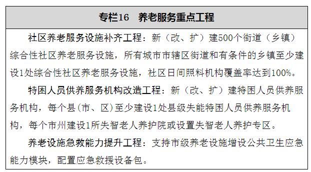 加快構(gòu)建養(yǎng)老、孝老、敬老政策體系和社會(huì)環(huán)境,推動(dòng)養(yǎng)老事業(yè)和養(yǎng)老產(chǎn)業(yè)協(xié)同發(fā)展。健全基本養(yǎng)老服務(wù)體系,發(fā)展普惠性養(yǎng)老服務(wù)和互助性養(yǎng)老,支持家庭承擔(dān)養(yǎng)老功能,培育養(yǎng)老新業(yè)態(tài),構(gòu)建居家社區(qū)機(jī)構(gòu)相協(xié)調(diào)、醫(yī)養(yǎng)康養(yǎng)相結(jié)合的養(yǎng)老服務(wù)體系,全省養(yǎng)老機(jī)構(gòu)護(hù)理型床位占比達(dá)到60%。加強(qiáng)社區(qū)養(yǎng)老服務(wù)設(shè)施建設(shè),鼓勵(lì)社會(huì)機(jī)構(gòu)興辦“智慧+”社區(qū)居家托老服務(wù)中心。落實(shí)養(yǎng)老服務(wù)稅費(fèi)、土地、金融等各項(xiàng)優(yōu)惠扶持政策,完善養(yǎng)老機(jī)構(gòu)建設(shè)運(yùn)營(yíng)補(bǔ)貼制度,全面放開養(yǎng)老服務(wù)市場(chǎng),支持養(yǎng)老機(jī)構(gòu)社會(huì)化發(fā)展。加強(qiáng)老年失能預(yù)防與干預(yù),基本實(shí)現(xiàn)65歲以上老年人健康體檢全覆蓋。保障老年人福利,探索建立失能失智老年人長(zhǎng)期照護(hù)服務(wù)制度。推動(dòng)農(nóng)村養(yǎng)老服務(wù)提質(zhì)升級(jí),全面建立農(nóng)村留守老年人定期巡訪制度。健全養(yǎng)老服務(wù)綜合監(jiān)管制度,大力開展養(yǎng)老護(hù)理人員職業(yè)技能培訓(xùn),建立養(yǎng)老服務(wù)褒揚(yáng)機(jī)制和懲戒制度。大力發(fā)展老年教育,開展老年人智能技術(shù)教育,加強(qiáng)老年大學(xué)和老年學(xué)校建設(shè)。積極開發(fā)老齡資源,發(fā)展銀發(fā)經(jīng)濟(jì)。
