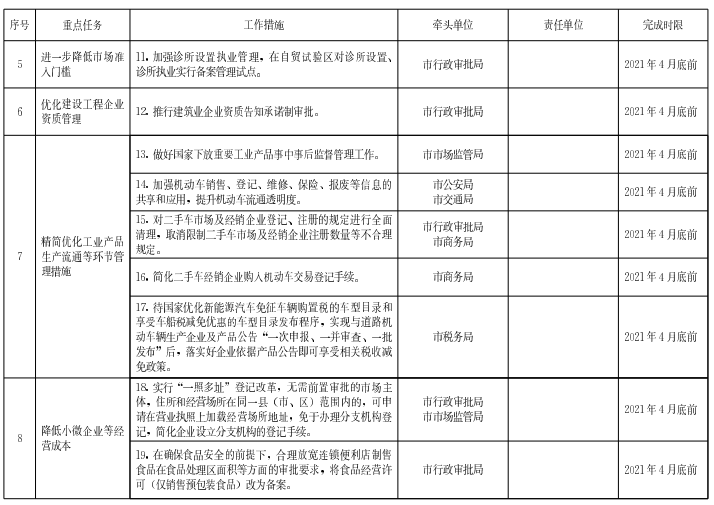 (五)進(jìn)一步降低市場準(zhǔn)入門檻。做好《市場準(zhǔn)入負(fù)面清單(2020年版)》實施工作,嚴(yán)格落實“一張清單”管理模式,確保“一單盡列、單外無單”。圍繞工程建設(shè)、教育、醫(yī)療、體育等領(lǐng)域開展集中清理,清除市有關(guān)部門和各市在市場準(zhǔn)入方面對企業(yè)資質(zhì)、資金、股比、人員、場所等設(shè)置的不合理條件,列出臺賬并逐項明確解決措施、責(zé)任主體和完成時限。加強(qiáng)診所設(shè)置執(zhí)業(yè)管理,在自貿(mào)試驗區(qū)對診所設(shè)置、診所執(zhí)業(yè)實行備案管理試點,條件成熟后在全市推廣。