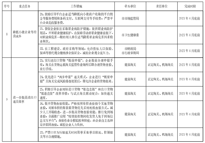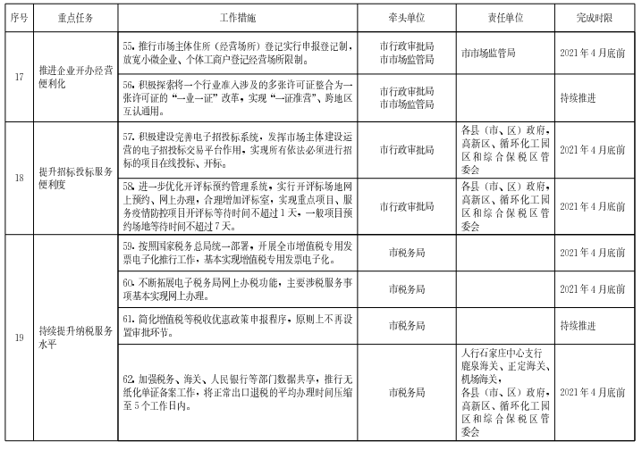 為貫徹落實《河北省人民政府辦公廳關(guān)于進(jìn)一步優(yōu)化營商環(huán)境更好服務(wù)市場主體若干措施》(冀政辦字〔2020〕170號)精神,結(jié)合統(tǒng)籌常態(tài)化疫情防控和經(jīng)濟(jì)社會發(fā)展要求,更好服務(wù)市場主體,切實解決企業(yè)生產(chǎn)經(jīng)營中的堵點、痛點、難點,加快建設(shè)一流營商環(huán)境體系,制定如下措施。