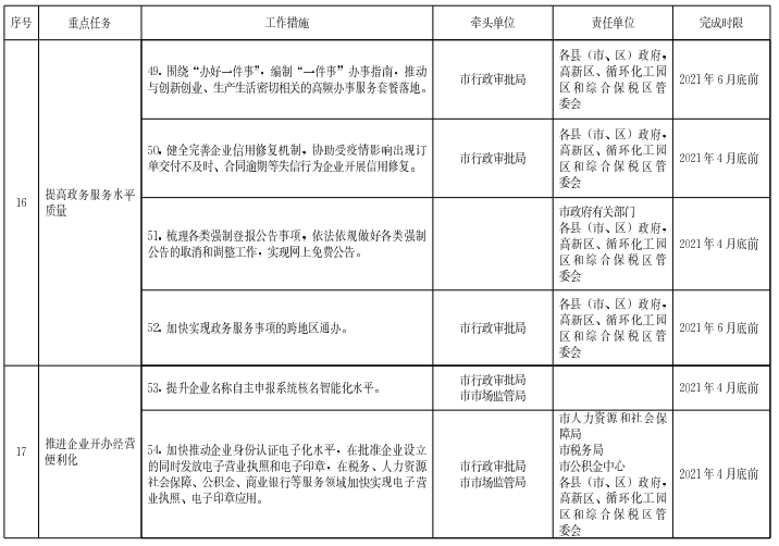 (十六)提高政務(wù)服務(wù)水平質(zhì)量。優(yōu)化完善全市一體化政務(wù)服務(wù)平臺功能,健全完善全市政務(wù)服務(wù)大數(shù)據(jù)庫,依托人工智能、區(qū)塊鏈、大數(shù)據(jù)、移動互聯(lián)網(wǎng)等現(xiàn)代信息技術(shù),推進(jìn)跨地區(qū)、跨部門、跨層級數(shù)據(jù)共享與融合,推動更多事項全流程網(wǎng)上辦理。圍繞“辦好一件事”,編制“一件事”辦事指南,推動與創(chuàng)新創(chuàng)業(yè)、生產(chǎn)生活密切相關(guān)的高頻辦事服務(wù)套餐落地。健全完善企業(yè)信用修復(fù)機(jī)制,協(xié)助受疫情影響出現(xiàn)訂單交付不及時、合同逾期等失信行為企業(yè)開展信用修復(fù)。梳理各類強(qiáng)制登報公告事項,依法依規(guī)做好各類強(qiáng)制公告的取消和調(diào)整工作,實現(xiàn)網(wǎng)上免費公告。加快實現(xiàn)政務(wù)服務(wù)事項的跨地區(qū)通辦。