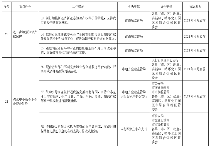 ?。ǘ唬?qiáng)化中小微企業(yè)資金供給。配合省部門不斷完善石家莊市金融服務(wù)平臺功能,開展形式多樣的融資對接活動。鼓勵引導(dǎo)商業(yè)銀行適度拓寬抵押物范圍,支持中小企業(yè)以應(yīng)收賬款、生產(chǎn)設(shè)備、產(chǎn)品、車輛、船舶、知識產(chǎn)權(quán)等動產(chǎn)和權(quán)利進(jìn)行融資擔(dān)保。應(yīng)用好以擔(dān)保人名稱為索引的電子數(shù)據(jù)庫,實現(xiàn)對擔(dān)保品登記狀態(tài)信息的在線查詢、修改或撤銷。推動規(guī)范和減免企業(yè)融資中的不合理收費,精簡審批程序,提高信貸規(guī)模和比重。