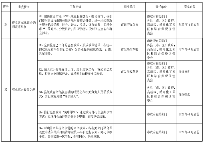 ?。ǘ撸?qiáng)化惠企政策兌現(xiàn)。全面梳理已出臺的惠企政策,形成政策清單,在統(tǒng)一的政策發(fā)布平臺進(jìn)行公布,為企業(yè)提供在線檢索、訂閱、匹配服務(wù)。加大惠企政策解讀力度,線上線下結(jié)合,方式靈活多樣,根據(jù)企業(yè)所屬行業(yè)、規(guī)模等主動精準(zhǔn)推送政策??h級政府出臺惠企措施時要公布相關(guān)負(fù)責(zé)人及聯(lián)系方式,實行政策兌現(xiàn)“落實到人”。推行惠企政策“免申即享”,通過政府部門信息共享等方式,實現(xiàn)符合條件的企業(yè)免予申報、直接享受政策。對確需企業(yè)提出申請的惠企政策,各有關(guān)部門要合理設(shè)置申請條件并列出清單在統(tǒng)一平臺進(jìn)行發(fā)布,簡化申報手續(xù),加快實現(xiàn)一次申報、全程網(wǎng)辦、快速兌現(xiàn)。