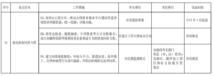 (二十八)強(qiáng)化督查問責(zé)力度。加快在石家莊市一體化在線政務(wù)服務(wù)平臺建設(shè)營商環(huán)境投訴舉報渠道,統(tǒng)一受理,分級辦理。將常態(tài)檢查、隨機(jī)抽查、專項督查等方式有機(jī)集合,加大對破壞營商環(huán)境和侵害企業(yè)利益行為的督查問責(zé)力度。建立內(nèi)部通報制度,對執(zhí)行不力、推諉扯皮、效率低下、紀(jì)律松弛等行為進(jìn)行通報,并依法依規(guī)依紀(jì)追責(zé)問責(zé)。