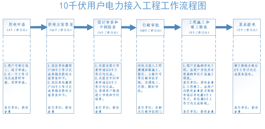 對于10千伏高壓單電源用戶,供電企業(yè)10個工作日內(nèi)完成供電方案答復(fù)。在受電工程建設(shè)完成具備接電條件下,用戶平均接電時間不超過4個工作日。(注:基于“對用戶設(shè)計(jì)、施工、供貨環(huán)節(jié)三不指定”的紅線要求,接電時限不包含用戶自主委托設(shè)計(jì)、施工和設(shè)備材料采購環(huán)節(jié))。對于10千伏高壓雙電源用戶,供電企業(yè)15個工作日內(nèi)完成供電方案答復(fù)。在受電工程建設(shè)完成具備接電條件下,用戶平均接電時間不超過5個工作日。(國網(wǎng)贛州供電公司、市行政審批局按職責(zé)分工負(fù)責(zé))