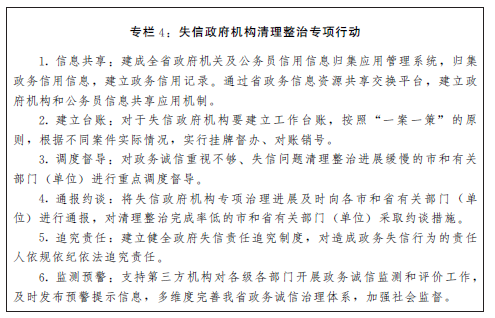 健全政府守信踐諾機(jī)制。將守信踐諾情況納入政務(wù)信用記錄,推動(dòng)各級(jí)各部門(mén)樹(shù)立誠(chéng)信意識(shí)和提高誠(chéng)信水平。持續(xù)開(kāi)展失信政府機(jī)構(gòu)清理整治專(zhuān)項(xiàng)行動(dòng),聚焦“新官不理舊賬”等突出問(wèn)題,采取有力措施,徹底清理存量,嚴(yán)防發(fā)生增量,對(duì)失信政府機(jī)構(gòu)“零容忍”。