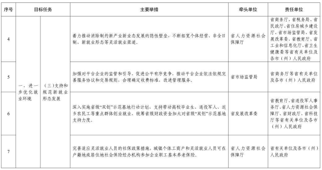 (三)支持和規(guī)范新就業(yè)形態(tài)發(fā)展。著力推動消除制約新產(chǎn)業(yè)新業(yè)態(tài)發(fā)展的隱性壁壘,不斷拓寬個體經(jīng)營、非全日制、新就業(yè)形態(tài)等靈活就業(yè)渠道。加強對平臺企業(yè)的監(jiān)管和引導,促進公平有序競爭,推動平臺企業(yè)依法依規(guī)完善服務協(xié)議和交易規(guī)則,合理確定收費標準,改進管理服務。深入實施省級“雙創(chuàng)”示范基地行動計劃,支持帶動高校畢業(yè)生、退役軍人、返鄉(xiāng)農(nóng)民工等重點群體創(chuàng)業(yè)就業(yè),統(tǒng)籌省級財政資金加大對省級“雙創(chuàng)”示范基地支持力度。完善適應靈活就業(yè)人員的社保政策措施,城鎮(zhèn)個體工商戶和靈活就業(yè)人員可在戶籍地或居住地社會保險經(jīng)辦機構參加企業(yè)職工基本養(yǎng)老保險。