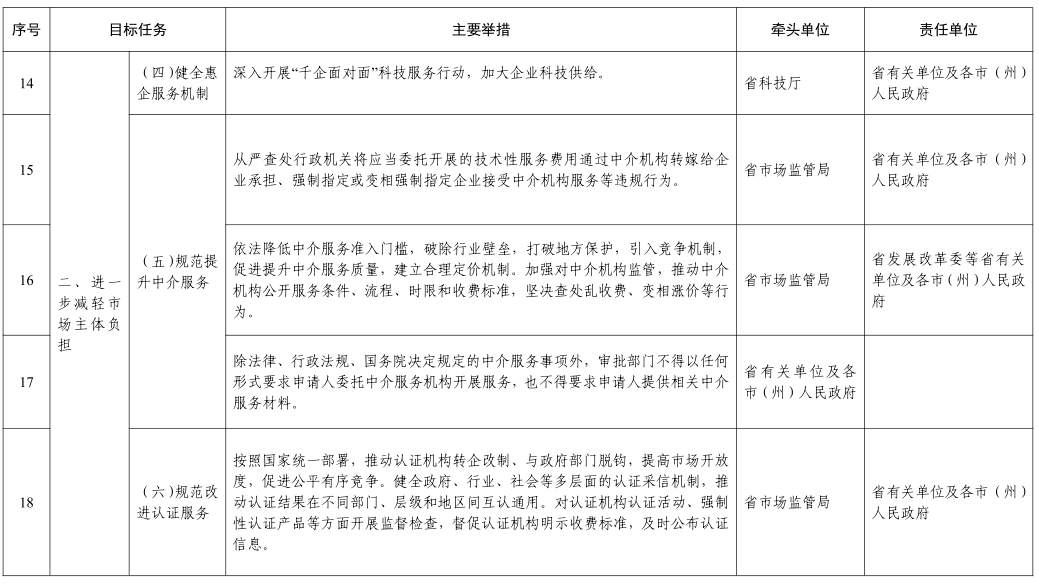 (七)優(yōu)化涉企審批服務。加強對已下放事項的監(jiān)督檢查和評估問效,進一步清理變相審批、違規(guī)審批、以備案之名行審批之實等行為。強化業(yè)務指導和專業(yè)培訓,確保下放事項“接得住、用得好”。清理規(guī)范行政審批前置條件和審批標準,明確行政備案材料、程序。進一步簡化企業(yè)登記程序和材料,加強跨部門業(yè)務協(xié)同,2021年底前將開辦企業(yè)時間壓縮至1個工作日以內(nèi)。加快貴州政務服務網(wǎng)與國家政務服務平臺服務入口統(tǒng)一,實現(xiàn)單點登錄,推動更多涉企事項網(wǎng)上辦理,簡化優(yōu)化商事服務流程,降低制度性交易成本。精簡優(yōu)化涉及電子電器產(chǎn)品的管理措施,探索推行企業(yè)自檢自證和產(chǎn)品系族管理。開展專利、商標、版權行政執(zhí)法行動,嚴厲打擊商標惡意注冊、非正常專利申請等行為。